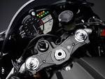 Yamaha R1's engine now has the shortest stroke of any 1000cc which would normally give a peaky power delivery though the new crank and firing order fill in the low and mid-range grunt. Peak power remains the same as before, but torque is up by 2ftlb. Now it stands at 179bhp@12,500rpm and the maximum torque of 85ftlb@10,000rpm. The motor has forged the same aluminium pistons, fracture-split conrods, ceramic composite plated cylinders, titanium inlet valves and exhaust and a slipper clutch. The piggy back generator has been moved down to the end of crank to make room for the new, lower fuel tank. The fuel injection system, featuring electronically controlled variable length inlet trumpets, now has shower injectors in upper airbox like the Yamaha R6. The fly-by-wire throttle system is modified to give better control of air intake volume.